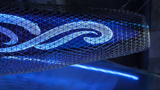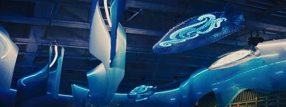 Waimahara conjures an experience of water flowing through a forested valley, with the underpass ceiling festooned with suspended hinaki-themed forms, holding illuminated tuna and curving blue-green nets of Kaynemaile architectural fabric. A comprehensive array of programmable lights and speakers soak the visitor in an audiovisual atmosphere: audio compositions constituted from audible worlds of manu, wai and taonga pūoro evoke a forest in this “urban jungle” site. Two specially composed waiata – Waimahara and Waiora – evoke the physical, emotional, spiritual and cultural significance of water for Māori; the composers’ lyrics speak of how knowledge of the world’s creation was stored, with intention, by atua (gods) within the essence of water. With the human body constituted largely by water, memories of this creation knowledge could be safeguarded, and never lost to humankind.